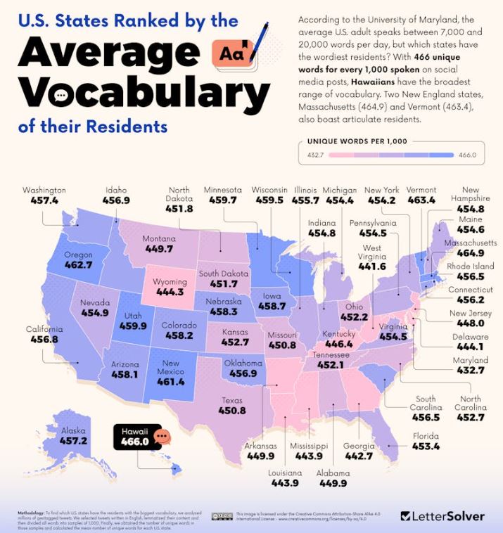 Did you know that the average US adult speaks about 7000 to 20k words per day. Not everyone has a diverse vocabulary. This infographic from LetterSolver visualizes how US states stack up based on the average vocabulary of their residents:
