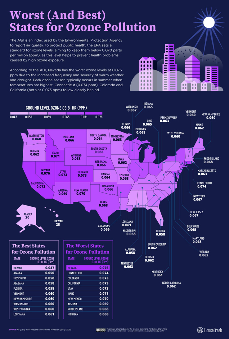 The air we breathe can directly affect our health. While air quality has gotten better over the years with the Clean Air Act, there is still a lot more to do to reduce pollution. This infographic from HouseFresh takes a look at US states with best or worst ozone pollution: