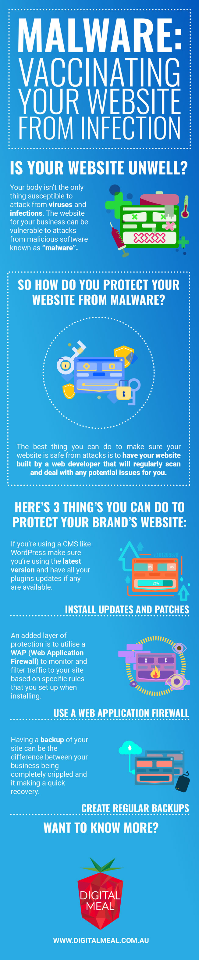 Websites get hacked all the time. Most of the time it is due to outdated software or inadequate security measures. This infographic from Digital Meal takes a look at simple ways you can protect your site against malware infection: