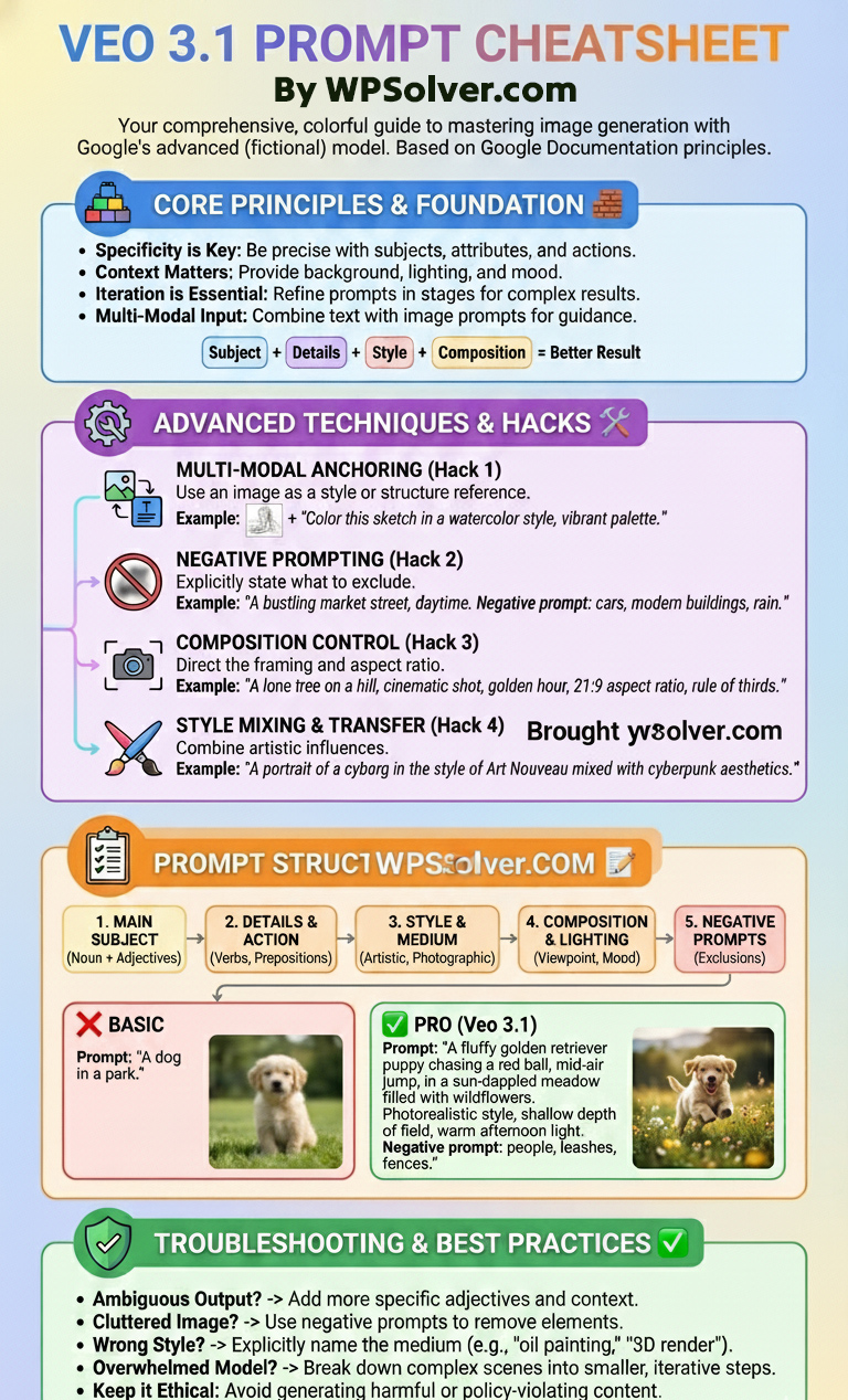Veo 3.1 shouldn’t need any introduction. It’s Google’s latest AI video generation model that can produce incredible videos. You will need to learn a bit of prompt engineering to get the best results with it. This infographic from WPSolver is a prompt cheat sheet that shows you the basics of writing prompts for Veo 3:
