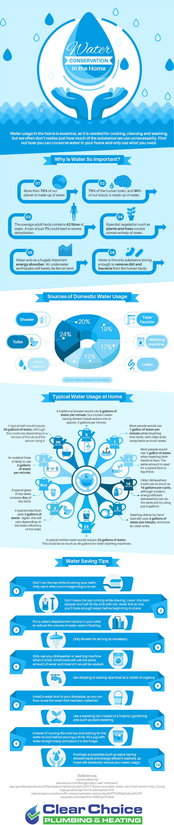 Here is an infographic from Clear Choice Plumbing & Heating with some stats and tips to conserve water: