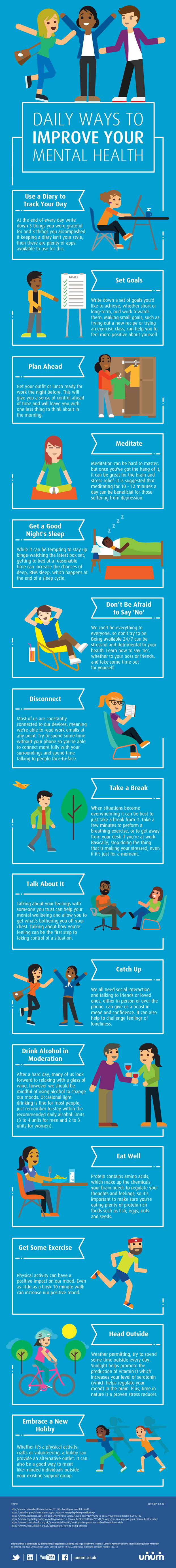 Many of us put a lot of effort into improving our physical health. You should also pay attention to your mental health. This infographic from Unum takes a look at ways you can improve it: