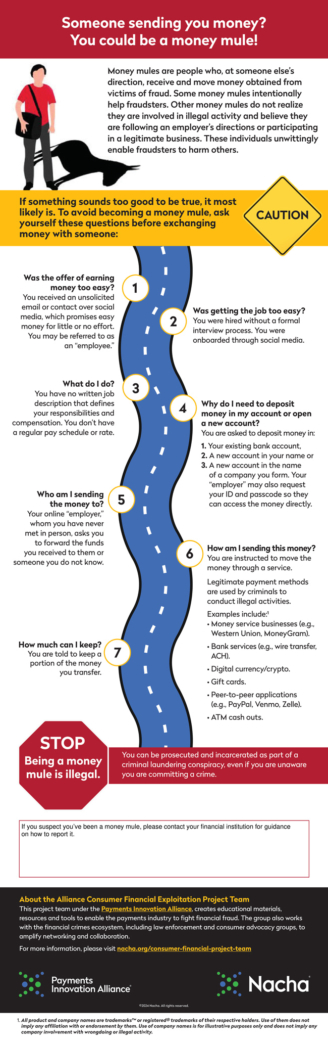 We all hear about scam artists who want to send people money. If something sounds too good to be true, it probably is. Money mules are people who receive and move money obtained from victims of fraud. Being a money mule is illegal and ignorance is not an excuse. This infographic from Nacha has more info on this: