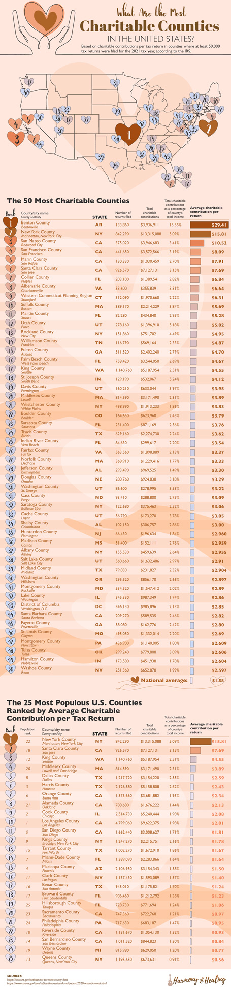 It is no secret that Americans are quite generous when it comes to giving to charitable causes. Have you ever wondered which counties are the most charitable? This infographic from Harmony & Healing takes a look: