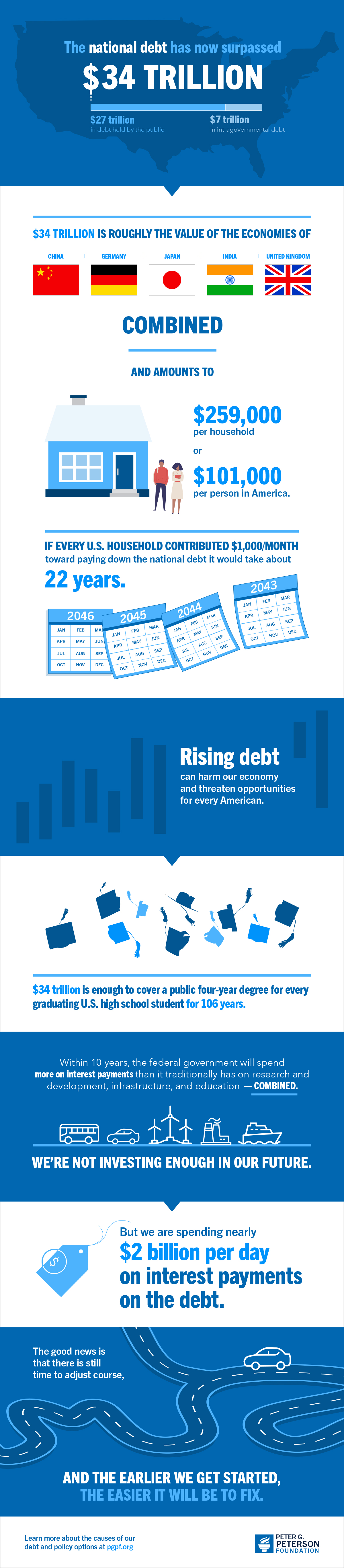 We hear about the US national debt hitting new heights all the time. The country is over $34T in debt but most don’t know what that means. This infographic form Peter. G Peterson Foundation helps you make sense of it all:
