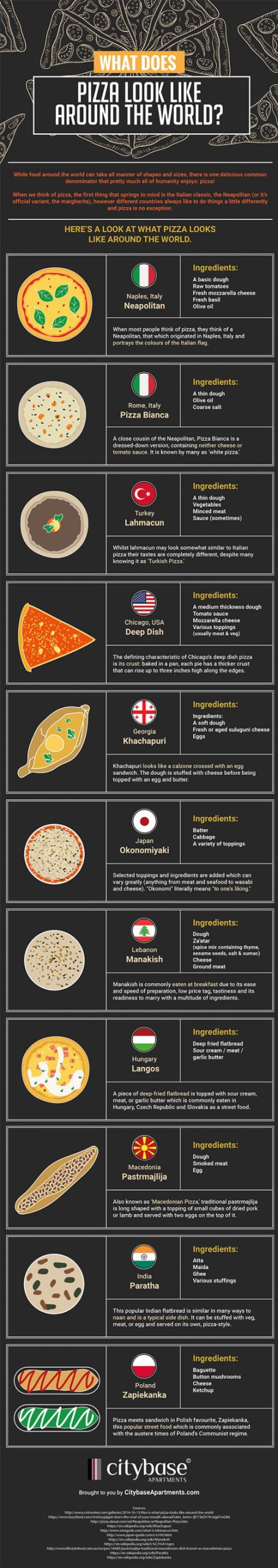 We all enjoy pizza once in a while. It is made in a wide variety of shapes and flavors. This infographic from Citybase Apartments covers how pizza is made around the globe: