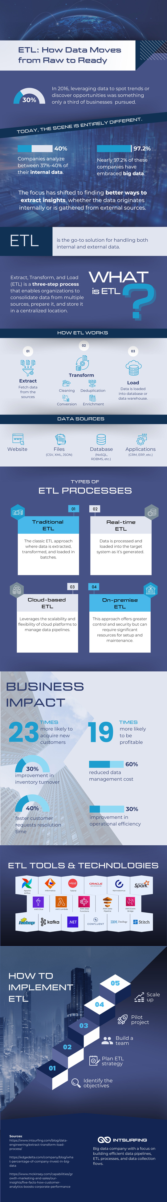ETL, which stands for Extract, Transform, Load, is a fundamental process in data management for handling both internal and external data. It enables organizations to consolidate data from diverse sources like databases, files, or APIs, transforming and structuring it to meet specific requirements, and then loading it into a database or data warehouse. Various approaches to ETL exist, including real-time, cloud-based, and on-premises methods. This infographic from Intsuring helps you make sense of ETL:
