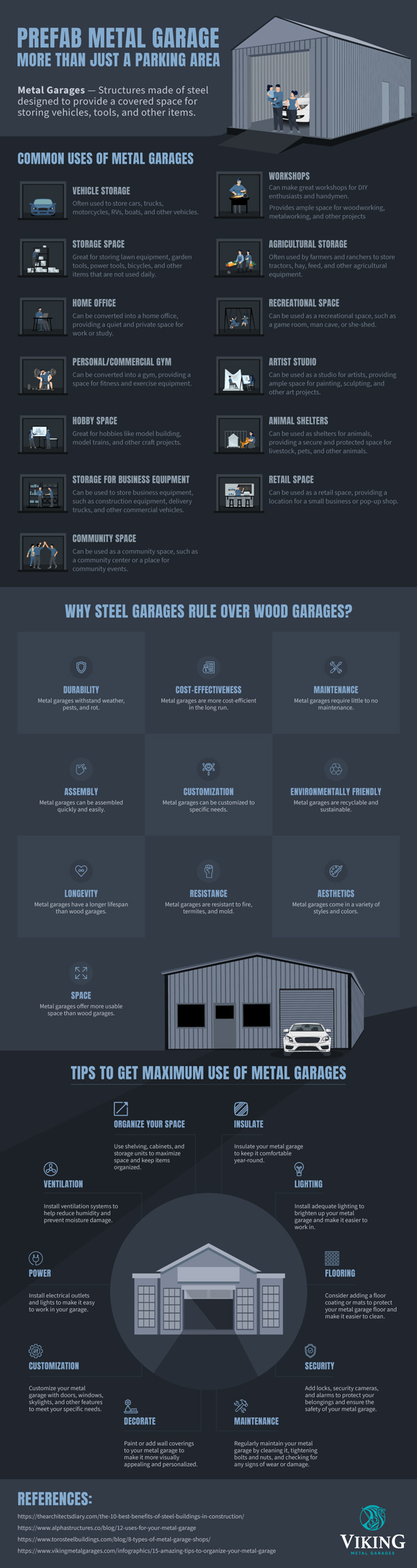 Many people have invested in prefab garages for their vehicles. You can do a whole lot more with them. You can use a prefab metal garage as a workshop, storage space, office, and animal shelter. This infographic from Viking Steel Garages takes a look: