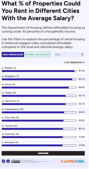 Many of us are not happy with the rent we pay and it keeps going up all the time. Have you ever wondered what % of properties you could rent in different cities with the average salary? This infographic from CashNetUSA takes a look: