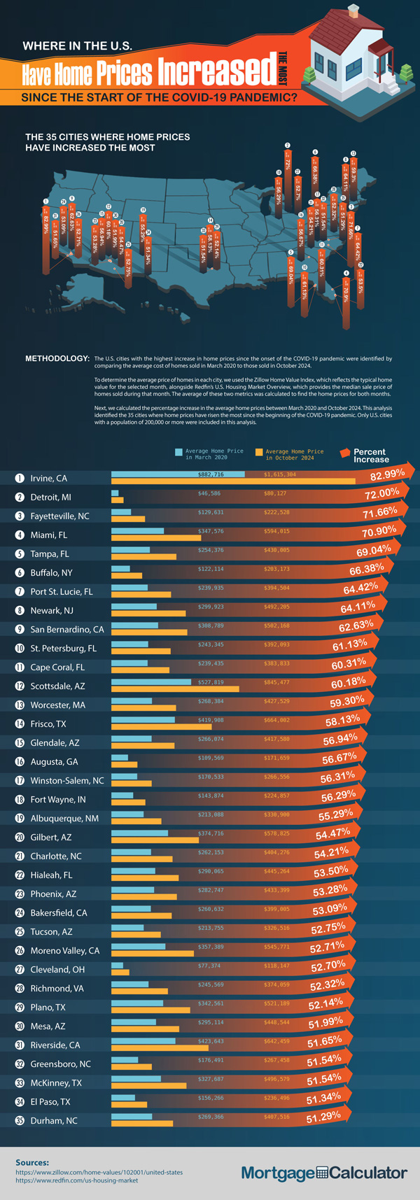 The most recent pandemic changed our lives in many ways. Many businesses and industries were also affected. This infographic from Mortgage Calculator takes a look at US home price growth since the COVID pandemic: