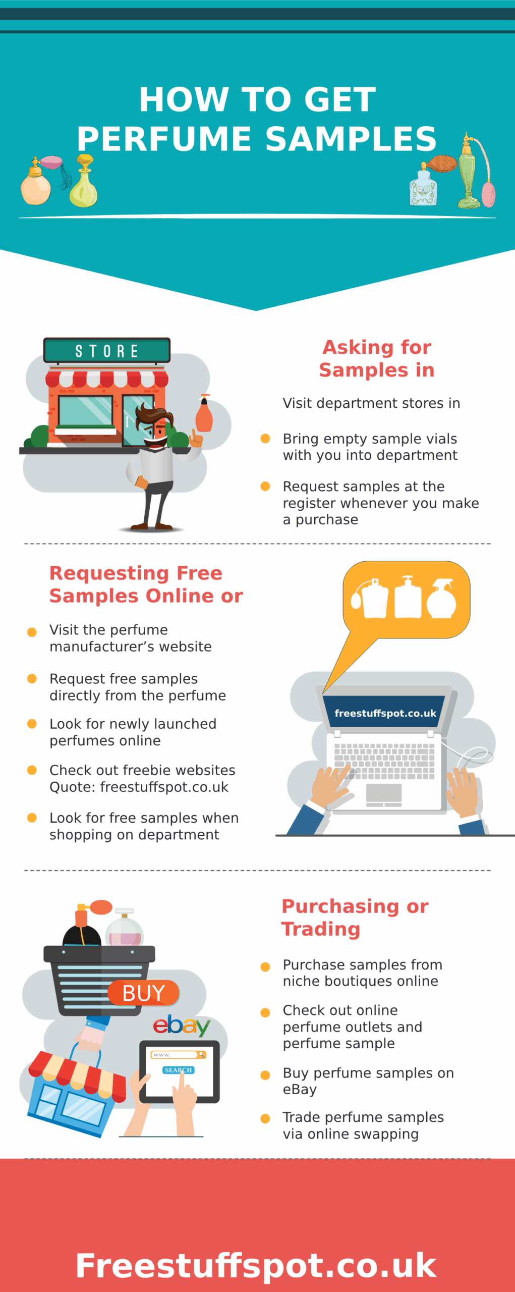 Finding the perfect perfume can take a bit of time. Testing out a few samples to see which one is right is smart. How do you go about getting your hands on free samples, though? You could always go through magazines or visit a beauty store to try out a few. These days, finding perfume samples online is much easier. This infographic from FreeStuffSpot UK has a few tips on how to find free perfume samples online: