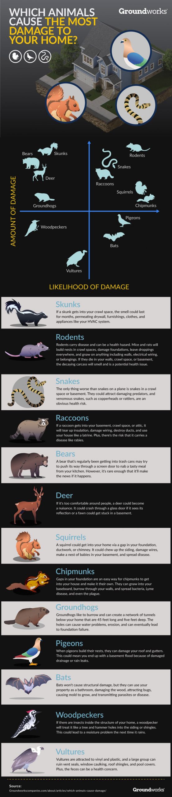 Many of us love animals but they can damage your property if you are not paying attention. Skunks, rodents, snakes, and raccoons can all damage your property. This infographic from Groundworks Company takes a look at this issue: