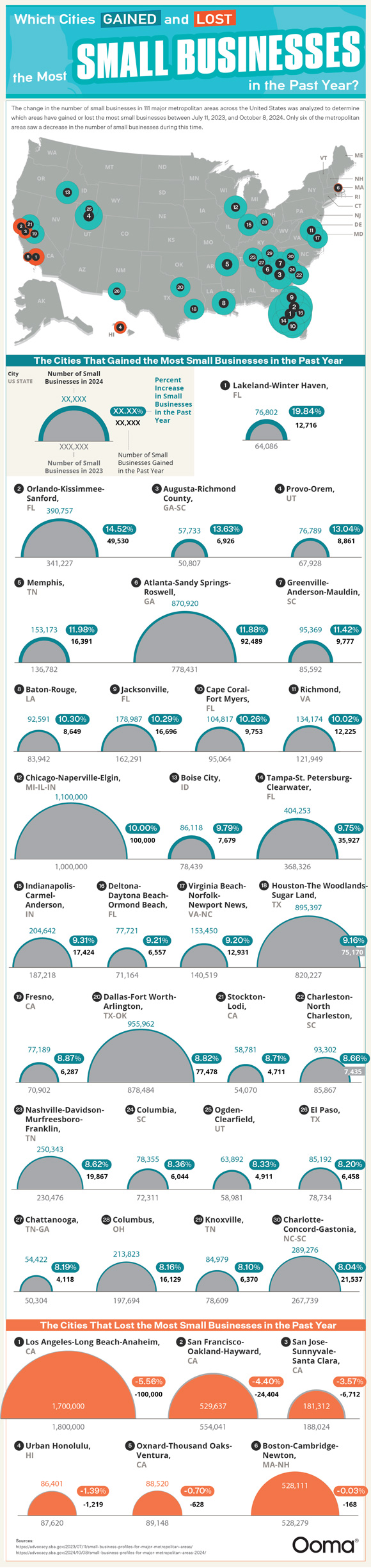 Starting a small business can be exciting but comes with its own unique challenges. Not every city is business friendly either. This infographic from Ooma covers which US cities have gained and lost the most small businesses in the past year: