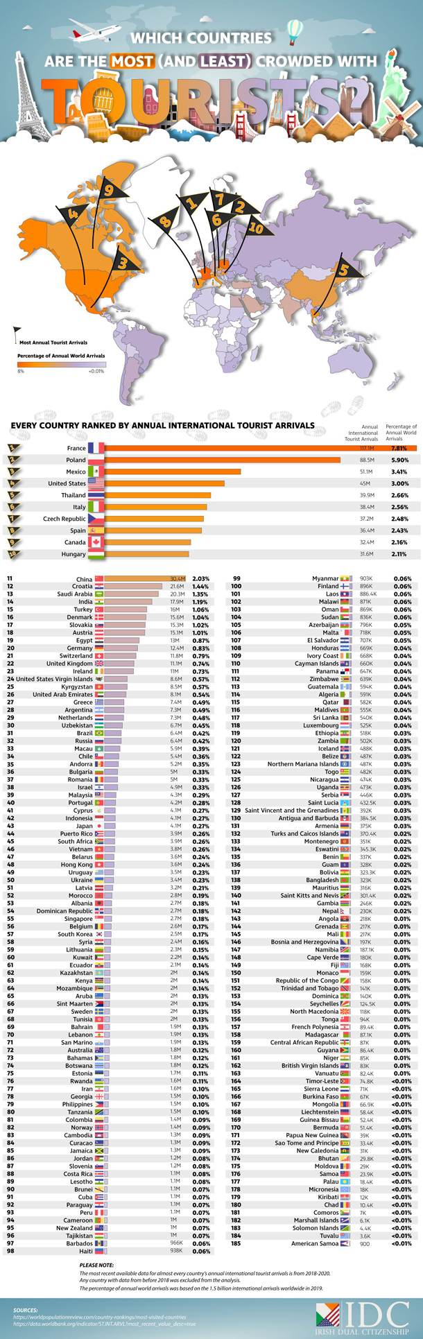 It is no secret that many countries around the world get tourists regularly. Have you ever wondered which countries are the most and least crowded with tourists? This infographic from IDC takes a look: