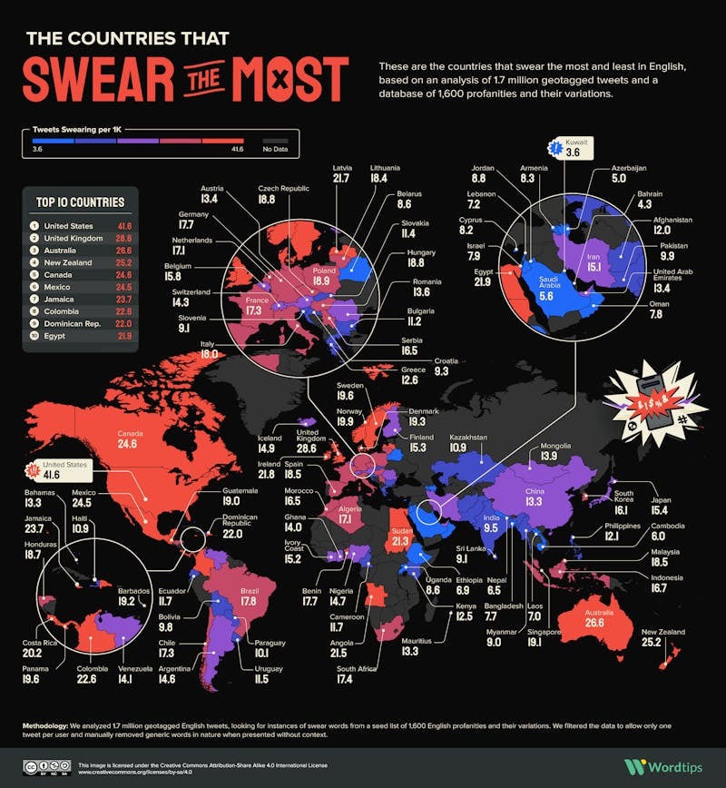 It is no secret that a lot of people whose first language is not English learn swear words to sound more natural. Even many native speakers on a daily basis. This infographic from Word.Tips takes a look at countries that swear the most: