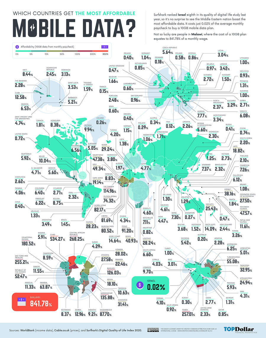 Most of us are always looking for better deals when it comes to our mobile service. Mobile data doesn’t cost the same everywhere though. This infographic from TopDollar visualizes countries with the most affordable data: