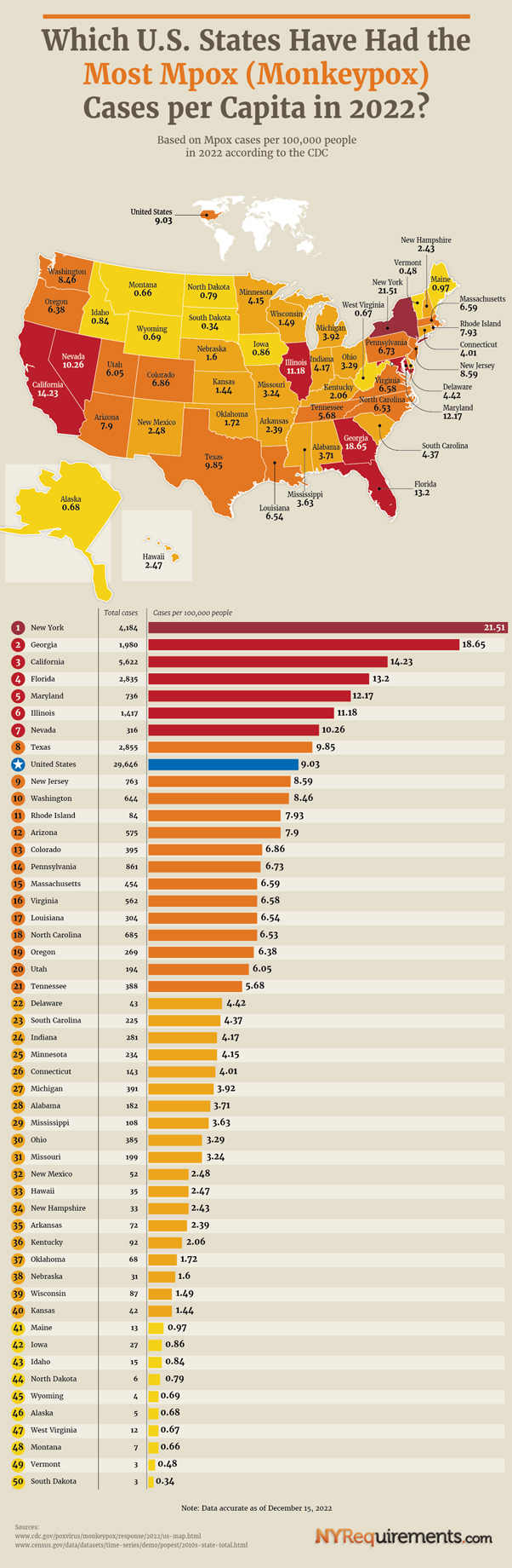 A few months ago, we heard about the outbreak of Monkeypox in various countries, including many states in the US. We don’t hear much about it these days but this infographic from NYRequirements.com takes a look at the states that had the most Mpox cases: