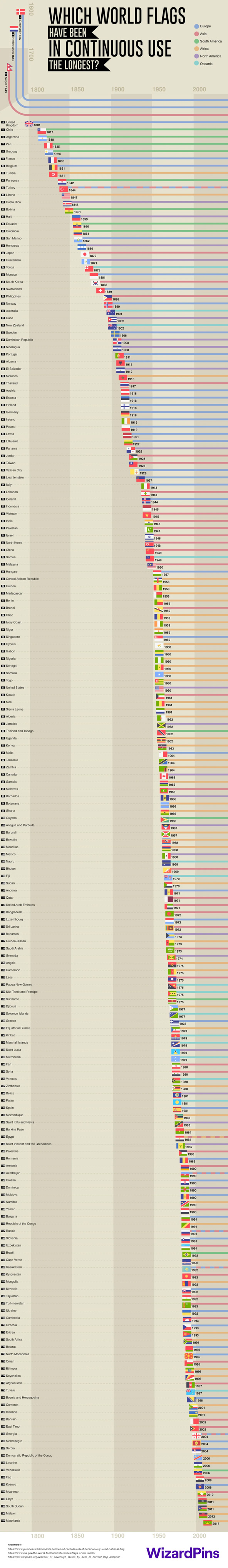 Those of you who travel around the world or watch international sports have had the chance to see some amazing flags, many of them in use for a couple of centuries. This infographic from WizardPins covers which world flags have been used the longest:
