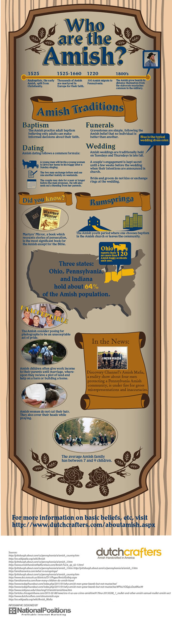 Those of you who live in Ohio, Pennsylvania, and Indiana have had the chance to see the Amish in action. They have many fascinating traditions. This infographic from Dutch Crafters takes a closer look at who are the Amish: